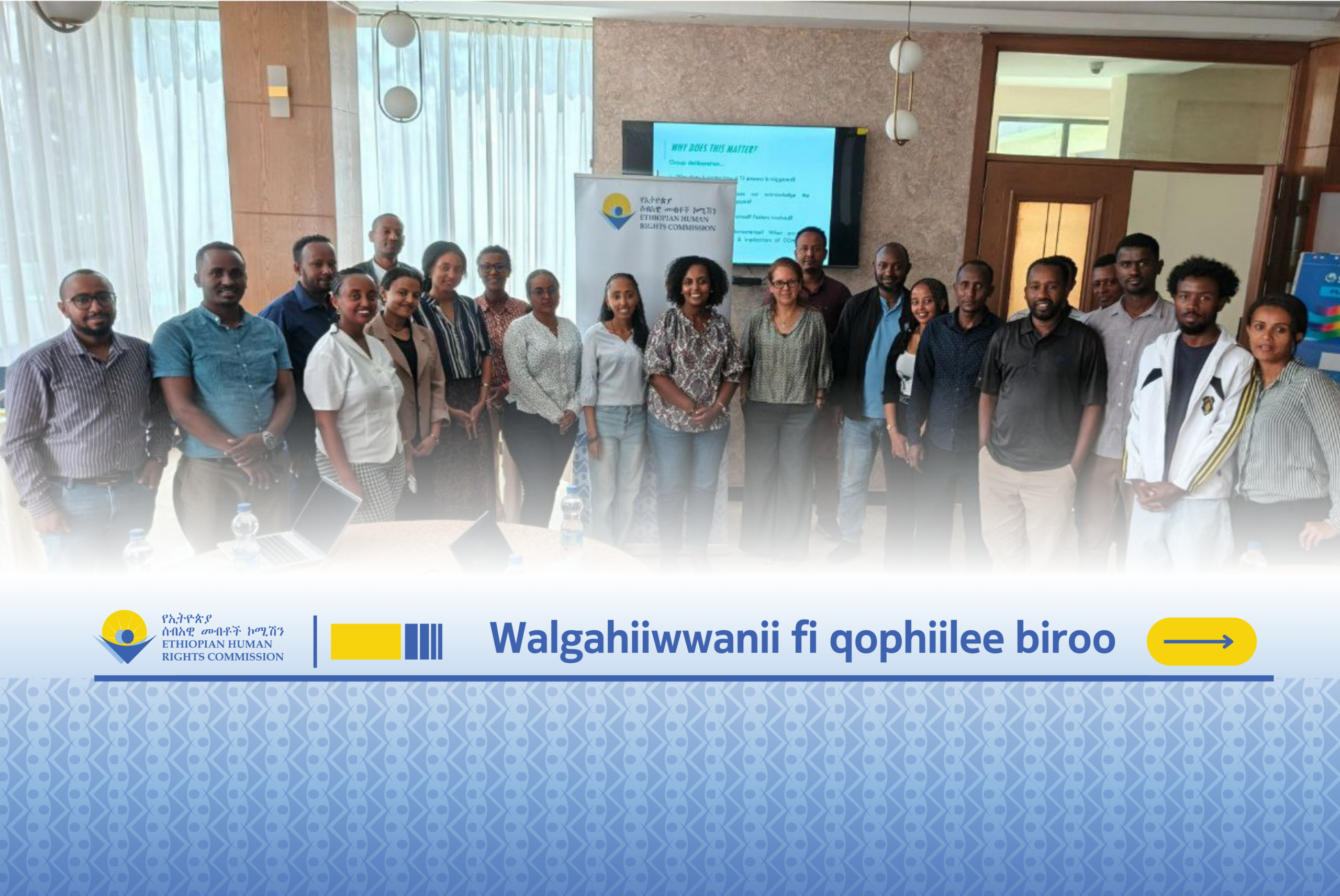 Komishiniin Mirgoota Namoomaa Itiyoophiyaa (KMNI) leenji leenjistoota ce’umsa haqaa irratti guyyoota lamaaf Bitootessa 8 fi 9, 2018 hojjattoota Kutaa Barnoota Mirgoota Namoomaa’tiif magaalaa Bischoofstuutti kenneera. Leenjiin kun beekumsa leenjistoota kutaa hojii gama ce’umsa haqaa irratti qaban fooyyessuu fi jaalleewwan kutaa hojii kanaa dandeettii ogummaa sadarkaa olaanaa kutaalee hawaasaa adda addaa fi qooda fudhattoota leenjisuuf isaan barbaachisu akka horatan taasisuudhaaf addatti kan qophaa’edha.