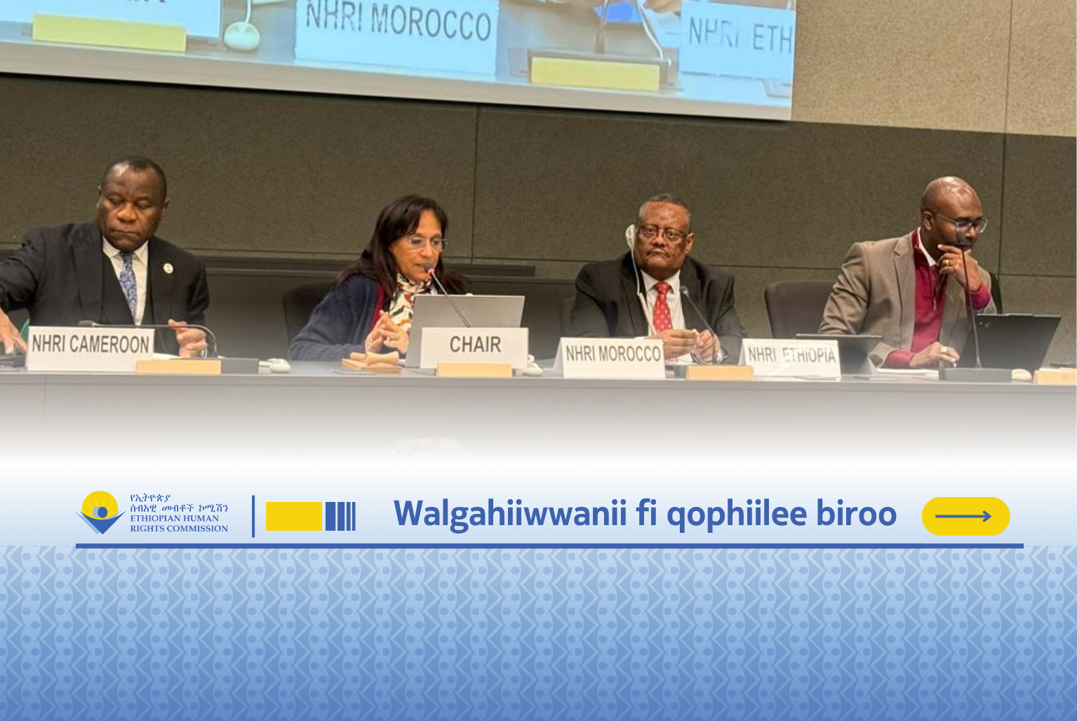 Bitootessa 30, 2026 Komishinarri Ol’aanaan Walgahii Naannoo Neetworkiin Dhaabbilee Mirgoota Namoomaa Biyyoolessaa Afrikaa (NANHRI) yeroo ammaa Itti Aanaa Dura Taa’aa ta’uun tajaajilaa jiran irratti hirmaataniiru. Guyyaa itti aanutti Komishinarri Ol’aanaan Yaa’ii Waliigalaa GANHRI marii hojii Waliigalaa Waggaa Gamtaa Dhaabbilee Mirgoota Namoomaa Biyyaalessaa, beekamtii Dhaabbilee Mirgoota Namoomaa Biyyaalessaa (NHRI Acreditation) irratti odeeffannoo haaraa, fi karoora hojii fi baajata GANHRI irratti mari’atame irratti hirmaataniiru.