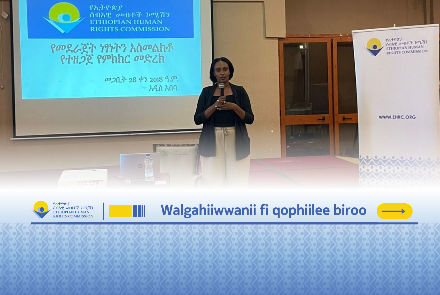 Komishiniin Mirgoota Namoomaa Itoophiyaa (KMNI) mirga gurmaa’inaa ilaalchisee Bitootessa 28, 2018 Finfinneetti qooda fudhattoota waliin marii gaggeesse. Maricharratti bakka bu’oonni dhaabbilee hawaasa siivikii, biiroo haqaa naannoolee, abbaa taayitaa sab-qunnamtii Itoophiyaa, konfedereeshinii waldaa hojjettoota Itoophiyaa, mana maree waloo paartilee siyaasaa Ityoophiyaa irraa babbayanii fi gaazexeessitootni hirmaataniiru.
